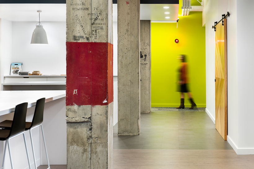 With accents of lime green, wood walls, glass office-fronts, and exposed concrete and brick, the interior is comfortable, bright and flexible providing a creative, inspiring place for folks to work and create.